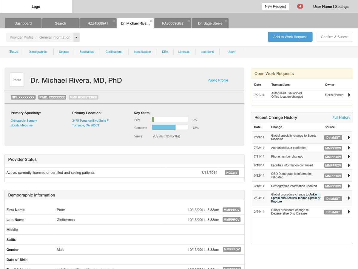 Beyond this, it was important to know the complete history of every data element for a particular provider. For each data element we added an information section that could be expanded to view the history and current status of the element.